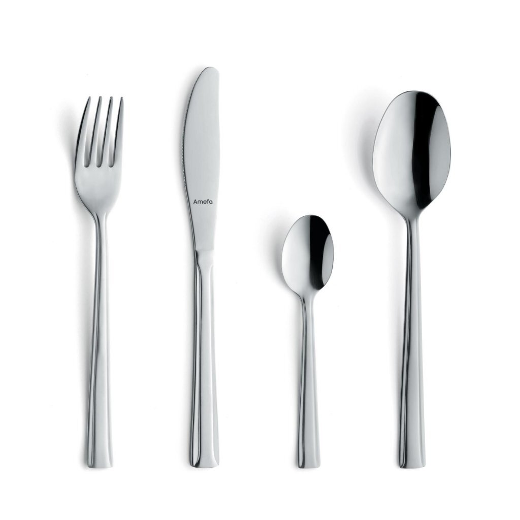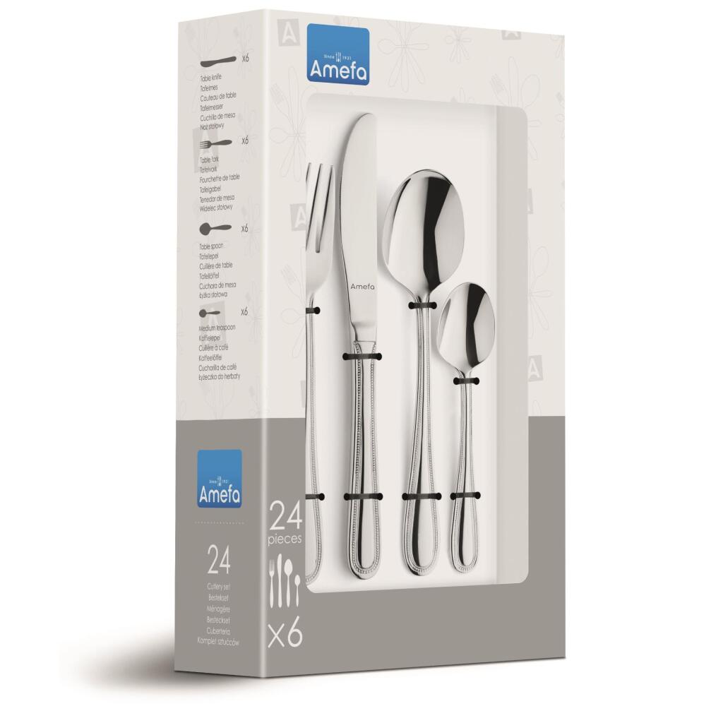 Deze 24-delige rvs bestekset Rimini van Amefa is gevaardigd met zorg en precisie, met een hoogglans zilveren afwerking. De set bestaat uit 6 messen, 6 vorken, 6 eetlepels en 6 theelepels. Geschikt voor in de vaatwasser.