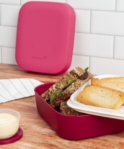 Lunchset bestaande uit brooddoos met tussenschot en sauspotje. Te gebruiken in klein, medium of groot. Geschikt voor magnetron, vriezer en vaatwasser. Met elastiek om alles bij elkaar te houden. Kleur: rood.