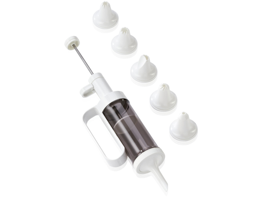 Praktische garneerspuit, heel eenvoudig met één hand te bedienen, voor het decoreren van taarten en buffetschotels. Of om soesjes te maken! Met de garneerspuit van Leifheit en de zes meegeleverde spuitmondjes kun je je helemaal uitleven. Toefjes, bloemen, lijnen, letters de meest fantasievolle creaties lukken met gemak, dankzij de traploze dosering en de vele verschillende spuitmondjes. Duim op de spuit zetten, en je kunt beginnen. De garneerspuit is snel en simpel te vullen en het schoonmaken is even snel en simpel.