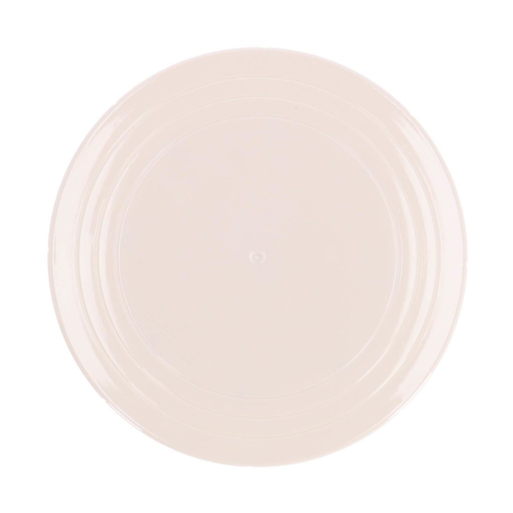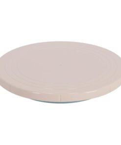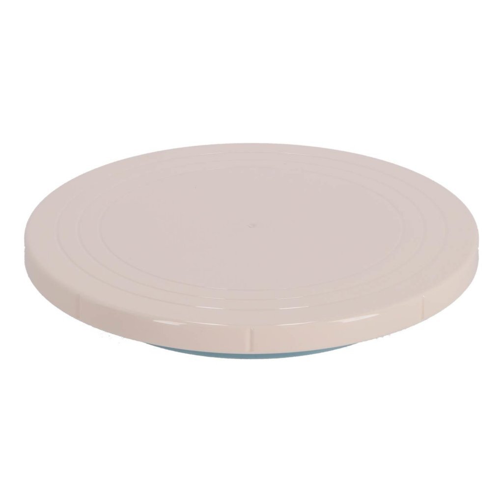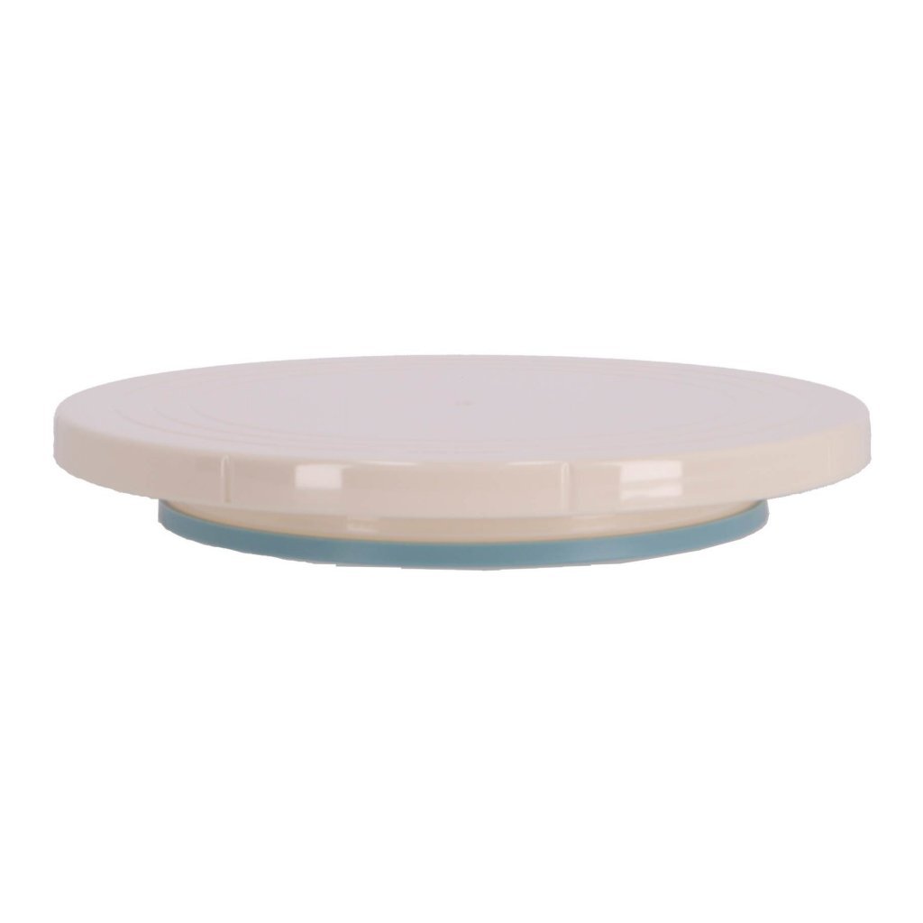 Een draaiend taartplateau voor het eenvoudig decoreren en tentoonstellen van taarten. Diameter: 27 cm. Hoogte: 3,5 cm. Materiaal: kunststof. Kleur: wit.