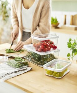 Deze set bestaande uit 3 verschillende formaten kunnen met elkaar worden gecombineerd, waardoor een compact en ruimtebesparend systeem ontstaat. Het inzetstuk met de gaatjes die je kunt verwijderen, laat het vocht weglopen, waardoor het voedsel langer vers blijft en ook beter beschermd is. Je kunt het multifunctionele deksel 180° draaien en dit biedt meer ruimte of perfecte stapelbaarheid. Je kunt ook altijd de inhoud in de gaten houden dankzij de transparante bodem. Richt je koelkast volledig opnieuw in en bespaar tijd bij het zoeken naar het gewenste voedsel. De mogelijkheid om de boxen te gebruiken bij temperaturen tot -20 ? maakt nog meer toepassingsgebieden mogelijk en de boxen kunnen vervolgens eenvoudig in de vaatwasser worden gereinigd. Het fraaie ontwerp van de koelkastorganizers is een blikvanger in je keuken en koelkast.