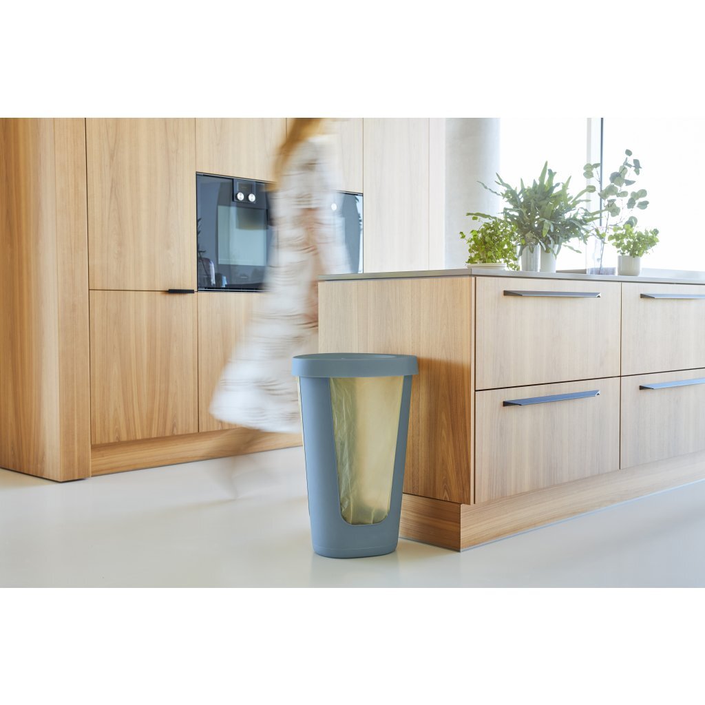 Dankzij de doordachte vorm biedt hij een ideale benutting van de ruimte.De vuilniszakkenstandaard biedt ideale ruimte voor de gele zak of andere vuilniszakken, die handig aan de drie afgeronde, flexibele hoeken worden bevestigd en net zo gemakkelijk worden verwijderd.Bovendien sluit de deksel veilig en geurdicht.