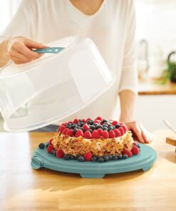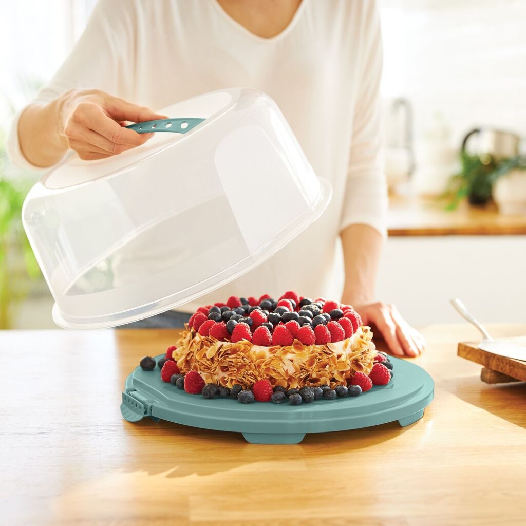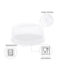 De FRESH cakevorm bestaat uit twee delen, die stevig en luchtdicht met elkaar verbonden zijn door de twee-kliksluitingen. De ergonomische draaggreep ligt prettig in de hand, waardoor hij gemakkelijk te vervoeren is. Met een binnenhoogte van 16 cm is de cakevorm geschikt voor platte cakes, taarten en soortgelijke gerechten. Inkepingen in de bodem maken het gemakkelijker om gelijkmatig te portioneren. Het gebruikte plastic is gemakkelijk schoon te maken en vaatwasserbestendig en bevat geen schadelijke stoffen voor de gezondheid of het milieu. De transportdoos is verkrijgbaar in verschillende kleuren. Als u regelmatig bakt, waarom zou u uzelf dan niet trakteren op meerdere cakevormen – ze kunnen eenvoudig in elkaar worden gestapeld voor opslag.