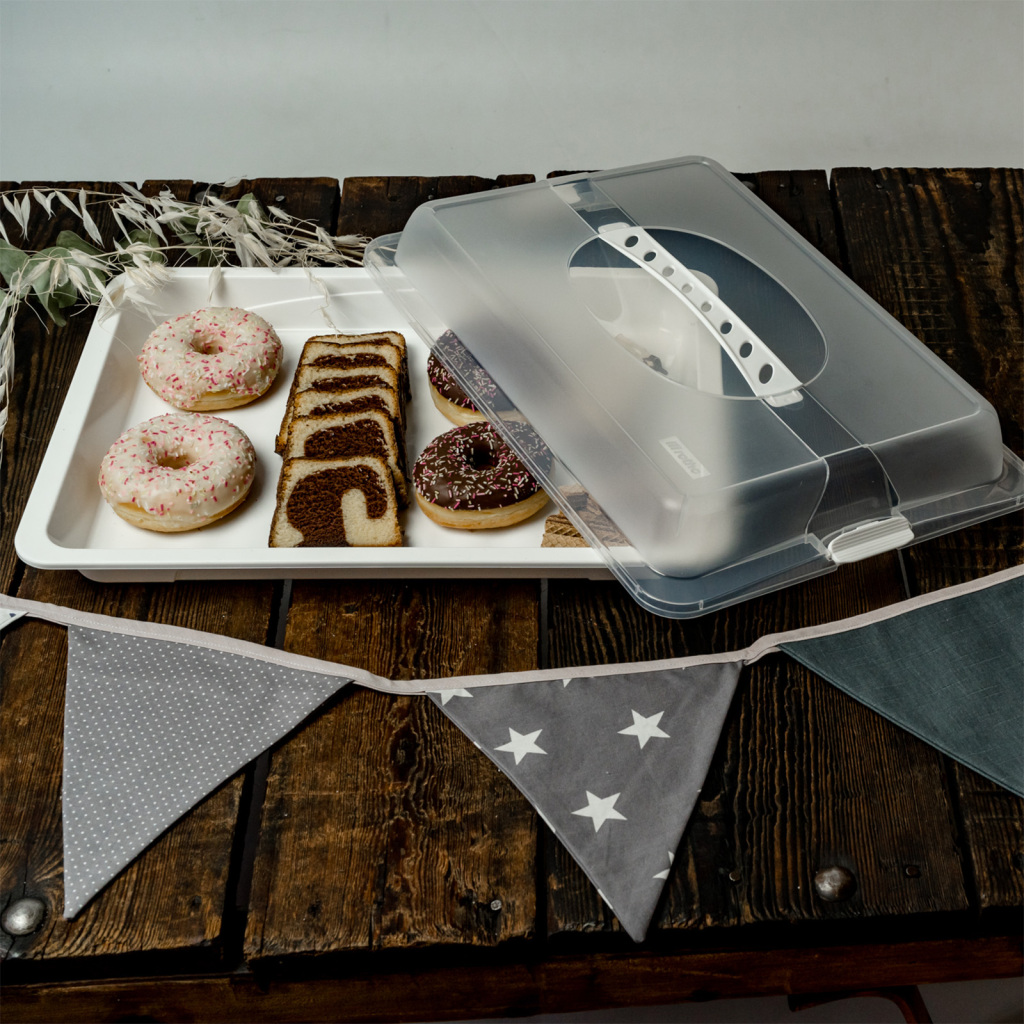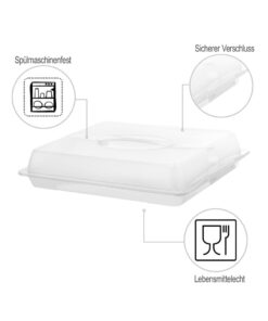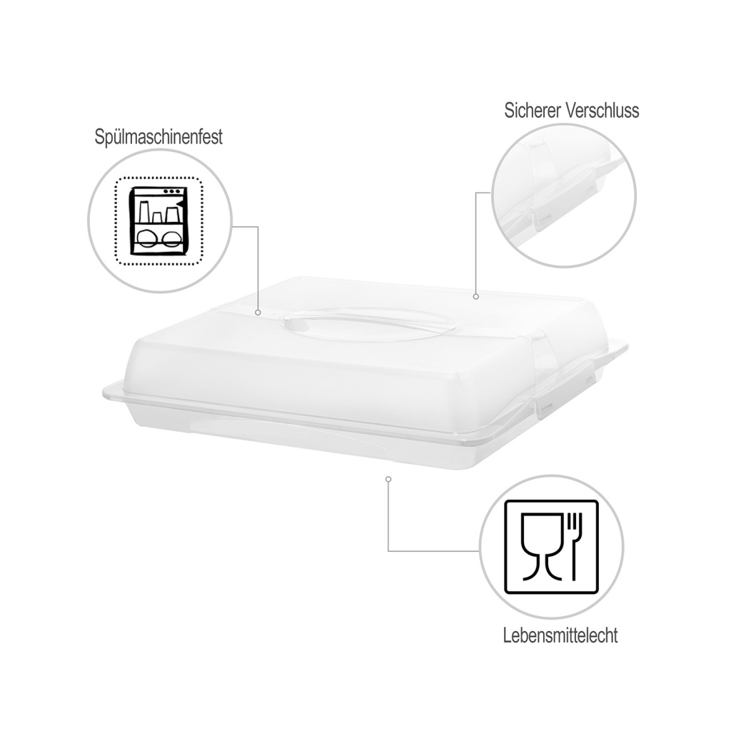 De partybutler JOHN is verkrijgbaar in verschillende praktische maten. Het is gemaakt van onderhoudsvriendelijk, vaatwasserbestendig plastic, dat uiteraard voedselveilig en BPA-vrij is. Het transparante deksel van de transportbox wordt met twee zijclips stevig aan de basis bevestigd, de geïntegreerde draaggreep ligt comfortabel in de hand en zorgt voor een comfortabel transport. Om uw voedsel vers te houden, zorgt de gegolfde bodem voor luchtcirculatie. Wanneer u de bakjes niet gebruikt, kunt u meerdere bakjes in elkaar stapelen om ruimte te besparen. Handig voor iedereen die graag bakt en de mensen om zich heen verwent met heerlijke hapjes en taarten.