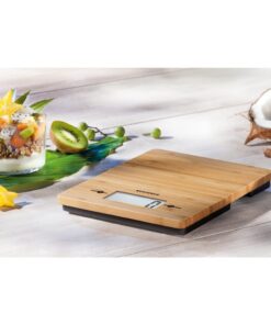 Bamboe – natuurlijk en trendy. De digitale keukenweegschaal Bamboo is een blikvanger en zorgt voor een natuurlijke frisheid in elke keuken. Het weegplateau is gemaakt van echt bamboe dat harmonieus in zijn moderne omgeving past en is hygiënisch dankzij het gemakkelijk te reinigen oppervlak. Aantrekkelijk en functioneel, het is zeer praktisch: aanraakgevoelig, dankzij de gepatenteerde Sensor Touch-technologie; handige extra gewichtsfunctie (tarra) voor het comfortabel toevoegen van verschillende ingrediënten; maximale belastbaarheid van 5 kg kan in 1 g nauwkeurige stappen worden gewogen; groot LCD-scherm met gemakkelijk af te lezen cijfers; en de energiebesparende ‘auto-off’-functie schakelt de weegschaal na gebruik automatisch uit.