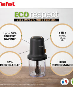 Het Eco Respect-assortiment bestaat uit de eerste ecologisch ontworpen voedselbereidingsproducten, welke zijn ontwikkeld om de impact op het milieu te verminderen. Het product wordt gemaakt van 23% gerecycled plastic (plastic = 49% van het totale productgewicht), geproduceerd in Frankrijk en geleverd in een eco-verpakking. Deze hakmolen is BPA-vrij, 93% recyclebaar en repareerbaar gedurende 10 jaar. Dankzij de krachtige motor van 500 W en de roestvrijstalenmessen kun je je ingrediënten gemakkelijk mixen, hakken en mengen.